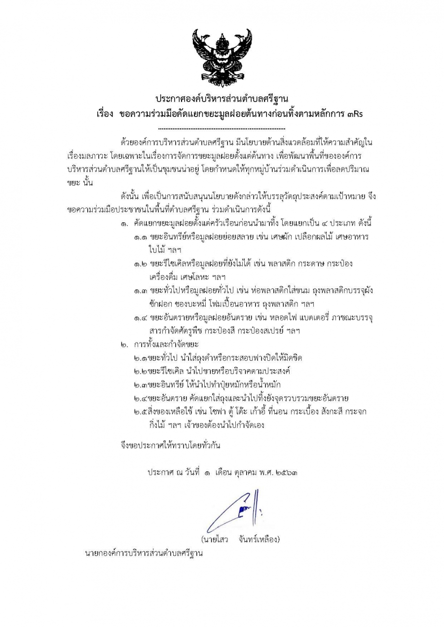 ประกาศ เรื่อง เรื่อง ขอความร่วมมือคัดแยกขยะมูลฝอยต้นทางก่อนทิ้งตามหลักการ 3Rs วันพฤหัสบดี, 01 ตุลาคม 2563 13:12 Print Email ดาวน์โหลดเอกสาร ประกาศ เรื่อง ขอความร่วมมือคัดแยกขยะมูลฝอยต้นทางก่อนทิ้งตามหลักการ 3Rs (158 Downloads) back to top