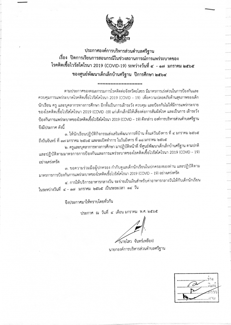 - ประกาศ เรื่อง ปิดการเรียนการสอนกรณีในช่วงสถานการณ์การแพร่ระบาดของ COVID-19 ของศูนย์พัฒนาเด็กเล็กบ้านศรีฐาน (146 Downloads)